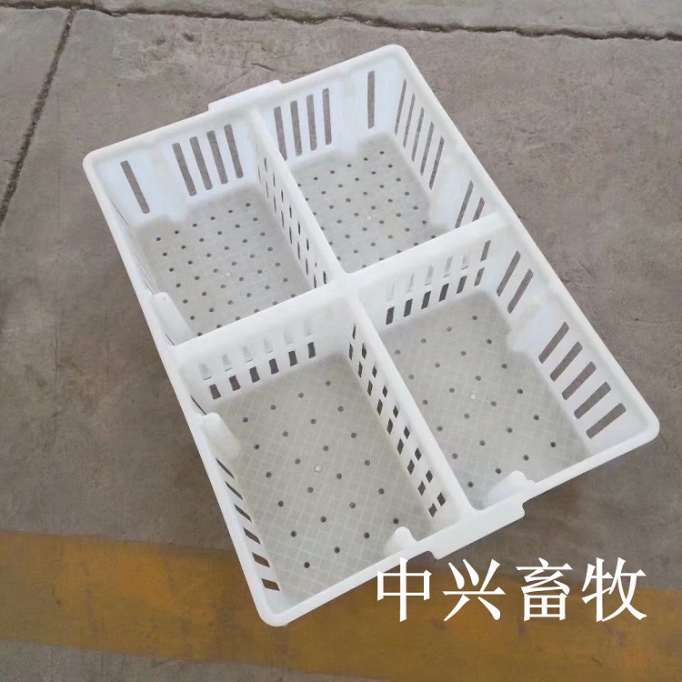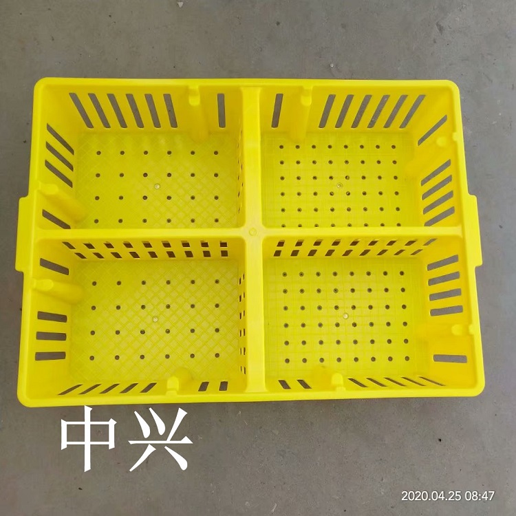 塑料鸡苗周转筐便于养殖厂的小鸡育雏分栏,每份可放25只小鸡,总共可放100只小鸡,小鸭每份可放20只,总共可放80只。