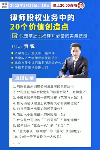 1月15、16日20:00,法律名家讲堂特邀到法学博士、西南政法大学律师学院副院长贾锐老师,为大家直播讲解《律师股权业务中的20个价值创造点》,帮助大家提升能力。