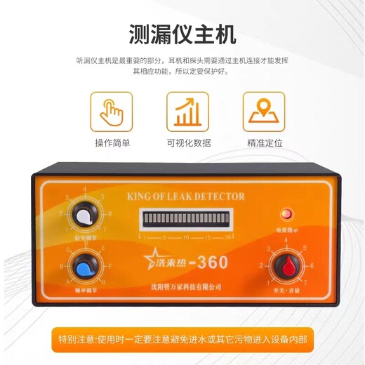 (洗来热-360)管道漏水检测仪是采用进口低功耗芯片微处理器和滤波器对噪声进行特殊处理的漏水检测仪器,采用设计的频率,高灵敏度振动传感器,将漏水点声音接收并转换为电信号,经过相应放大并做数字化滤波处理,可通过耳机听到声音,或观察20个LED仪表亮度判断漏点的准确位置。