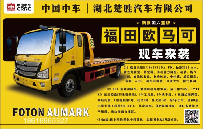 福田欧马可国六蓝牌清障车上装配置:采用新式冲孔冲压板 双侧联动操作装置,4吨液压绞盘(25米钢丝绳),辅助小车一对,七字抱胎装置一套,新式捆绑带4条,轮胎挡板一对,工具箱一个,后工作灯3只