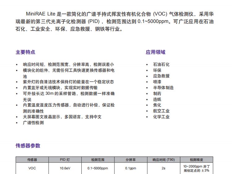 华瑞MiniRAE Lite PGM-7300VOC有机气体检测仪是一款的手持式便携式VOC气体检测仪,品牌RAE华瑞,第三代PID传感器,响应时间短,检测范围宽,大屏幕图文液晶显示,图形菜单显示,无需任何工具快速更换传感器和电池,多国语言显示,支持中文,传感器和紫外灯自动清洁,操作便捷,内置强力吸气泵,使检测更加快速。