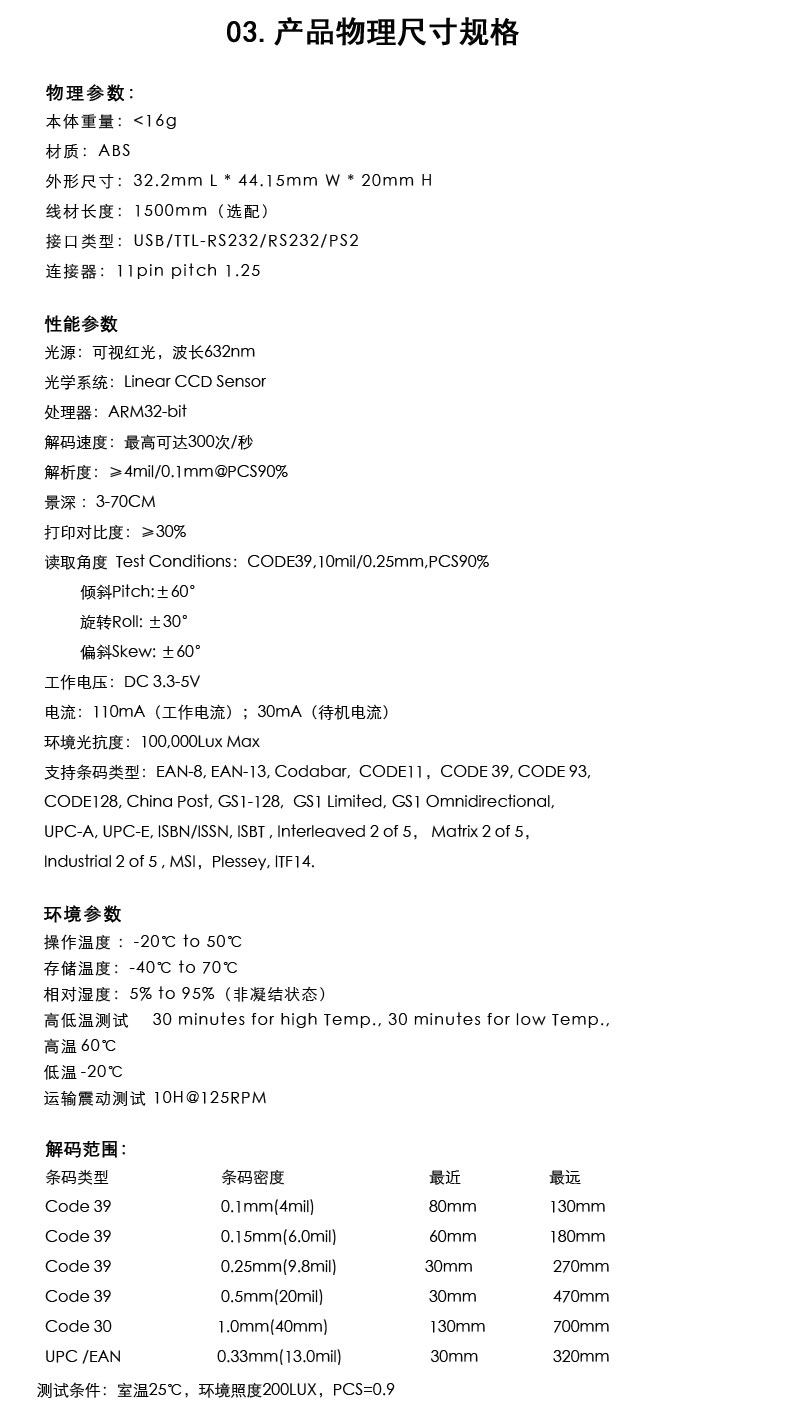 线性条码扫描:扫描条码,对印刷条码、纸质打印条码、屏幕条码都能轻松应对。即使在扫描磨损、褶皱或已损坏的条码也有良好的表现。