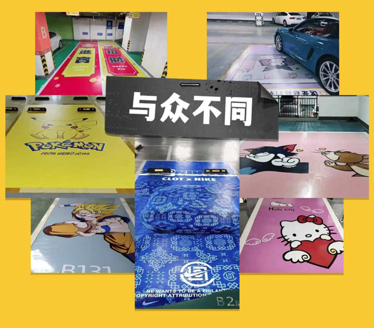 机器除了车位彩绘,我们地面打印机还可以在各大材质上面打印彩绘:亚克力,密度板,玻璃,瓷砖,木板,大理石,铝塑板,宣纸,画布,铁皮,等等,基本是一个平面都可以打印的。大型购物商场的地面,娱乐城,幼儿园等地面装饰