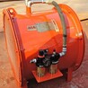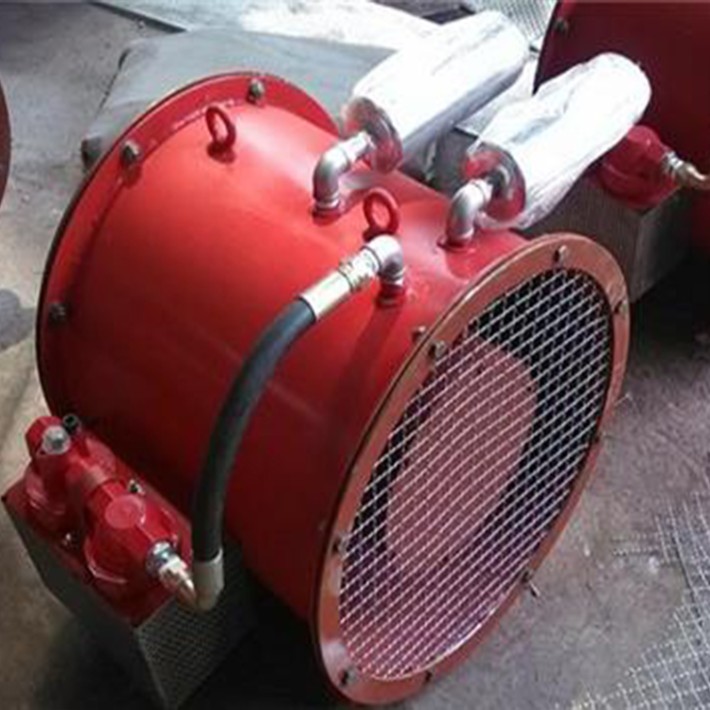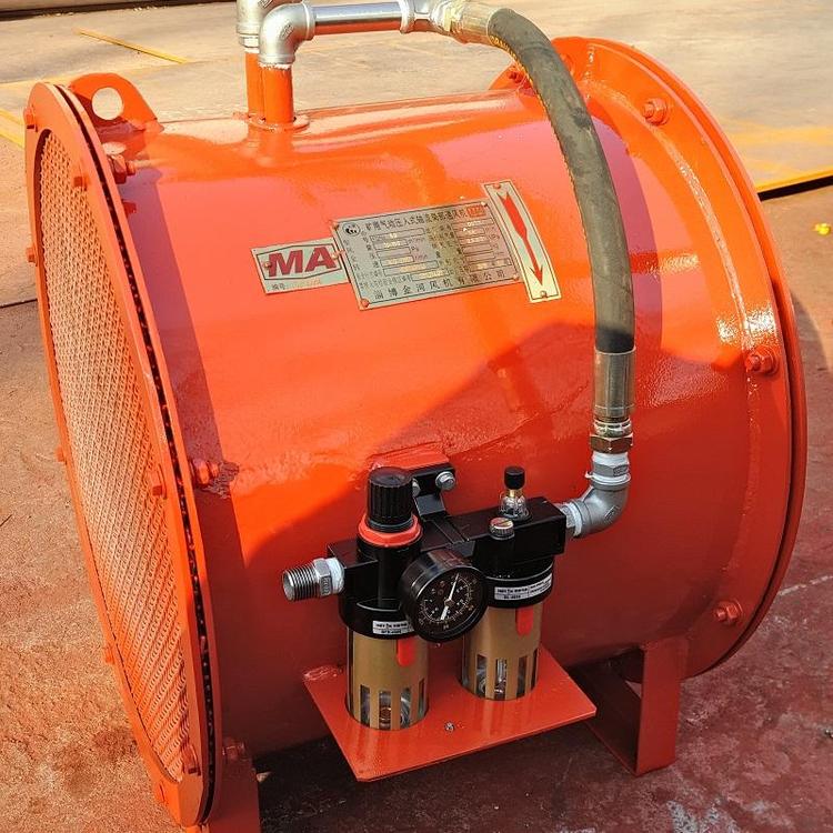 井下压气管道中引出的压气通过胶管与通风机机壳上的气动马达进气口联接后,开启阀门,压气驱动气动马达,带动叶轮旋转,叶轮对空气做功,使空气具有能量后以一定的速度排出风机,在排出风机前在导风的偏转下,使气流发生旋转。