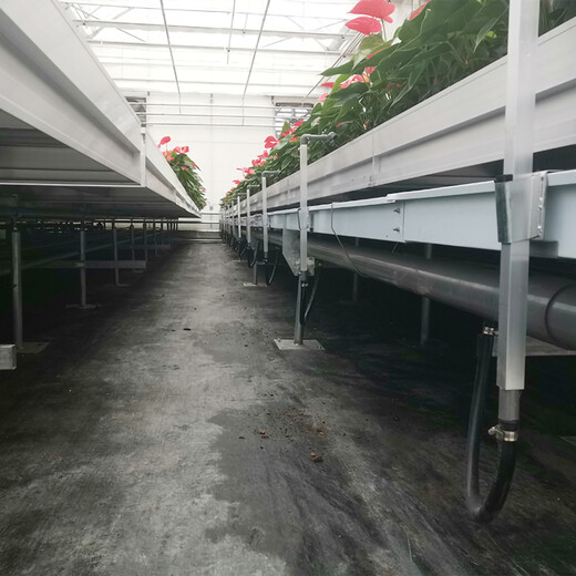 新式物流式苗床为了实现对温室中的盆栽植物进行运输,盆栽植物被放置在铝合金苗床内。苗床由两个铝合金侧板、两个铝合金隔板、底部横撑以及一个底盘组成。苗床的底部有四组滚轮,苗床可以在导轨上移动。苗床底部为汉明ABS潮汐灌溉底盘,承载能力约为70kg/m2。