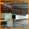 所述撒布机构具有使砂石分布均匀的布砂机构,结合翻转机构的作用,使砂石分布更均匀。该彩石金属瓦生产设备结构合理、涂胶和撒砂分布均匀、操作人员劳动强度低,有利于提高产品质量和降低生产成本。彩钢瓦机成型机广泛应用于工业民用建筑,如厂房、仓库、飞机库、体育馆、展览馆、影剧院等房面和墙体。建筑家电和交通运输等行业,对于建筑业主要用于钢结构厂房、机场、库房和冷冻等工业及商业建筑的屋顶墙面和门等,民用建筑采用彩石钢瓦的较少。