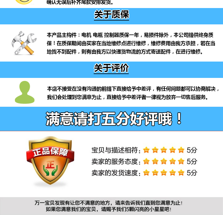 关于售后问题:我们厂家是服务,绝不是中间商,所有售后我们都是直接提供售后保障的,我们是终身维修。另外,电机电瓶控制器都是质保一年的,易损部件除外(如轮胎,厨具等,因为此类部件为长期使用,固不在质保范围内)。