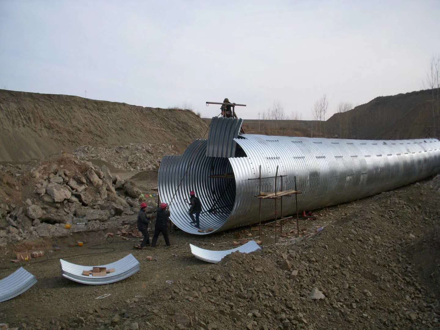 金属波纹涵管的防水及排水施工中为防止波纹涵管外发生的水压,有必要设置排水设备尽量降低水压(抑制发生水压会加重波纹涵管填土部位的载荷,会影响波纹涵管的变位)为了防止从钢板连接部及螺栓孔渗水,在螺栓连接部和钢板重叠部选择密封材料进行表面防水处理地下通道在组装完毕后,回填之前实施表面防水防水处理后待防水材料充分硬化后开始回填、回填及压实(1)波形钢板构造物的回填与压实对构造物的稳定性及耐久性起着重要的作用。波形钢板是一种弹性结构,所以填土特别重要。