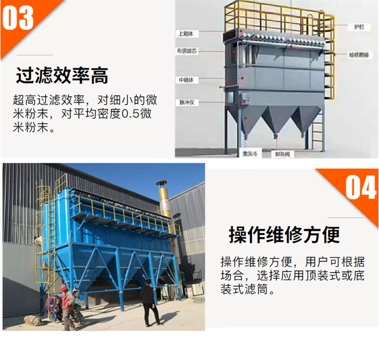 布袋除尘器结构主要由上部箱体、中部箱体、下部箱体(灰斗)、清灰系统和排灰机构等部分组成。布袋除尘器性能的好坏,除了正确选择滤袋材料外,清灰系统对布袋除尘器起着决定性的作用。
