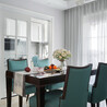 客厅与餐厅相连,用颜色划分成为两个空间,依然秉承简约的风格,简洁的顶面与石纹地花组成一种天朗地清既视感,让四壁的空间上也得到统一。吊灯使用时尚的现代风格,搭配孔雀蓝色与褐色的沙发、餐桌,造就了既放松又高雅的气质。