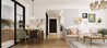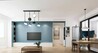 客厅、餐厅、厨房,三个空间都在同一水平线上,厨房和餐厅之间,用黑框的推拉门隔开,透明的玻璃门,没有阻挡视线,视觉空间变得非常大。