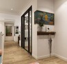 玄关的地方,对面的墙面上,有一幅装饰画,下面是用木质板做成的一个搁板,下面再设计挂钩,这样收纳作用和装饰作用都大大增强。
