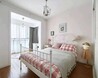 而儿童房的设计就会更为卡通一些,粉色的墙面搭配红白相间的床品,儿童房外还做了个立的小书房,方便孩子学习。