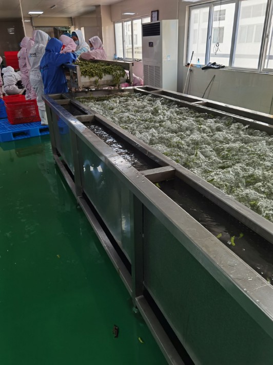 毛豆先要经过人员的挑选,挑选出不合格品和合格品,合格品通过输送带输送到毛豆粗洗清洗机里面,进行清洗,根据用户需求可在水中加入3ppm以上,每隔1.5小时在输送带末端取样2.5kg,按照原料规格标准目测和比照规格进行检验,不好的控制在10%以内,毛豆在清洗过程中,每隔1.5h从清洗槽中采取洗涤水,进行比色测定检测,保持在3ppm以上,由于生产过程中,输送带是不断运行的,操作人员注意防范,安排工作休息时间,调整输送带转速,避免视觉疲劳。