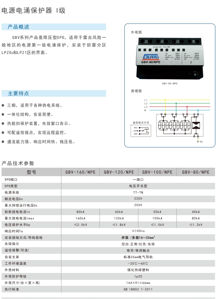 GBV系列产品是限压型SPD,适用于雷击风险一般地区的电源级电涌保护,安装于防雷分区LPZO和LPZ1区的界面。