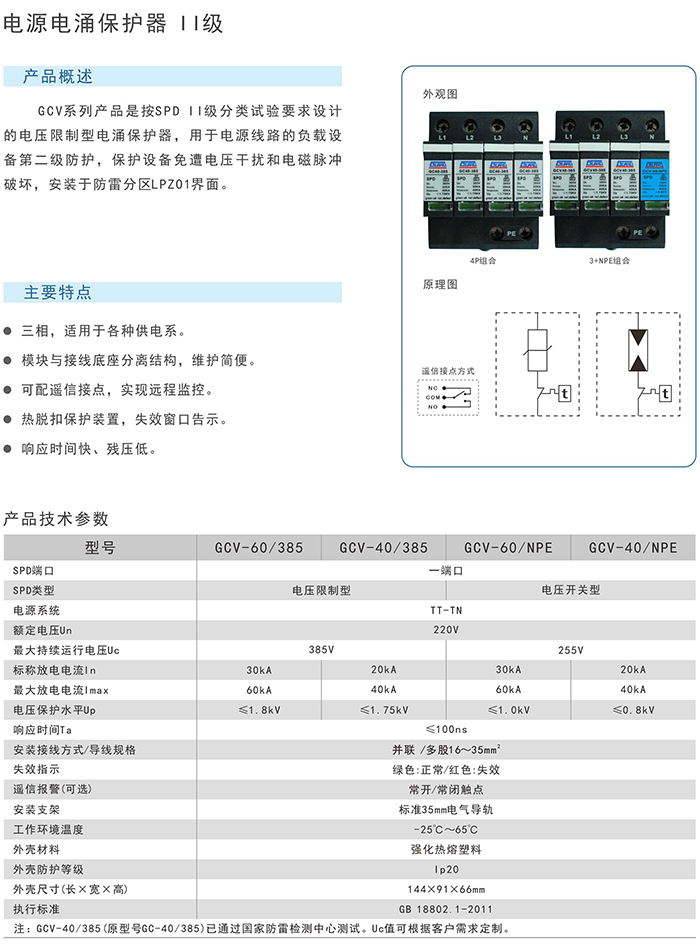 GCV系列产品是按SPD II级分类试验要求设计的电压限制型电涌保护器,用于电源线路的负载设备二级防护,保护设备免遭电压干扰和电磁脉冲破坏,安装于防雷分区LPZ01界面。
