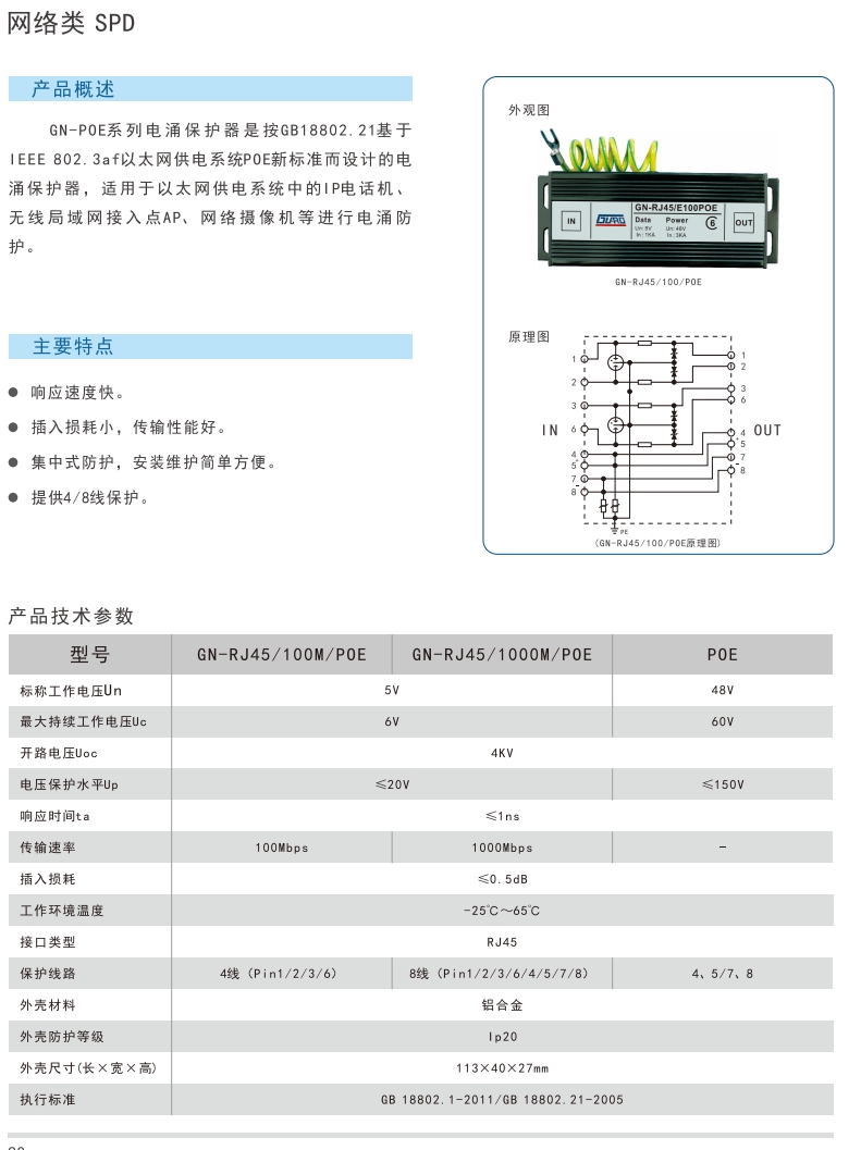 GN-RJ45/100M/POE系列电涌保护器是按GB18802.21基于IEEE 802.3af以太网供电系统POE新标准而设计的电涌保护器,适用于以太网供电系统中的IP电话机、无线局域网接入点AP、网络摄像机等进行电涌防护。