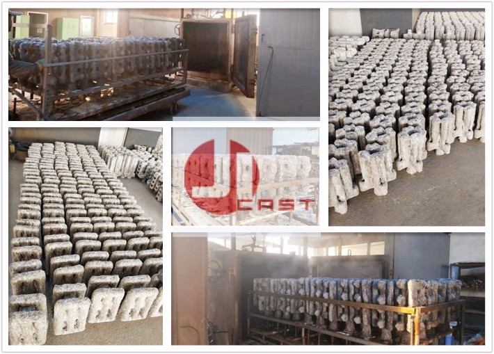 工厂车间的流水线全部是根据实际经验自主研发,在能产品质量的同时大大的提升了工作效率,并且为工人减少了工作量,截止到2015年底,我公司各个车间全部为自动化生产,例如:全自动射蜡机、硅溶胶工艺全自动的机器人、硅溶胶工艺全自动的风干线、水玻璃工艺全自动的流水线和固化池、全自动浇注。因为全部为自动化生产,所以前期了型壳的质量,可完成重量从0.1KG-500KG的精密铸造产品、壁薄低至3mm的产品、形状复杂的,有效的避免了气孔、砂眼、夹渣、冷隔、缩松、等铸造缺陷。