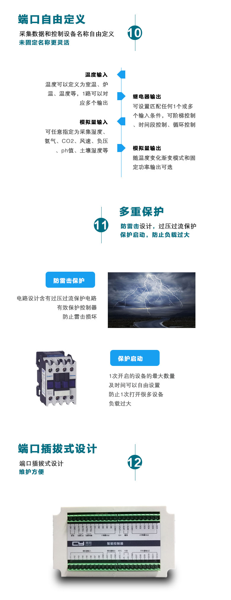 公司的产品包括养殖环控器、大棚种植控制器、温湿度控制仪、环境控制器、新风控制器、菇棚控制器、锅炉控制器、温湿度变送器、二氧化碳变送器、光照变送器、土壤温湿度变送器、土壤EC值变送器、土壤PH值变送器等,工业级设计,性能稳定可靠。
