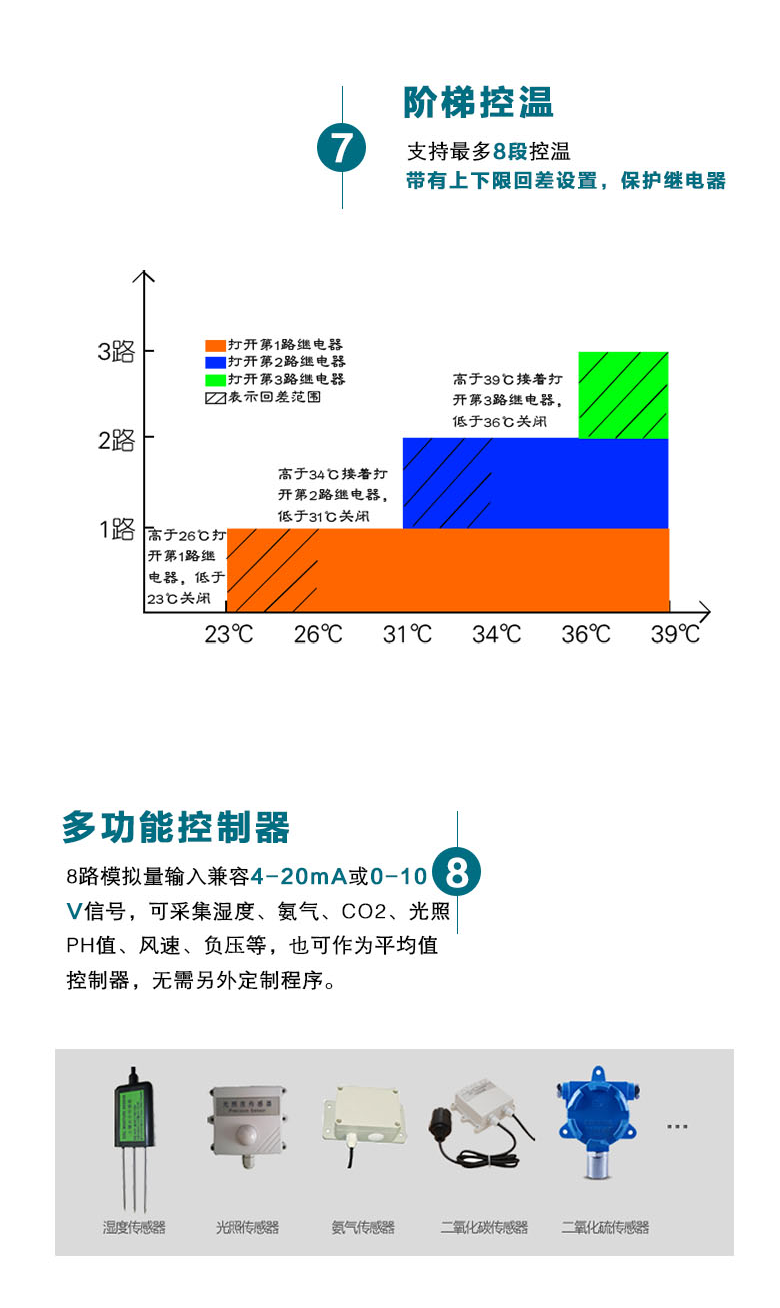 微电脑养殖温度控制器主要阶梯控温,生长曲线控温,自动控制风机启停,时间循环控制,多时段温度控制