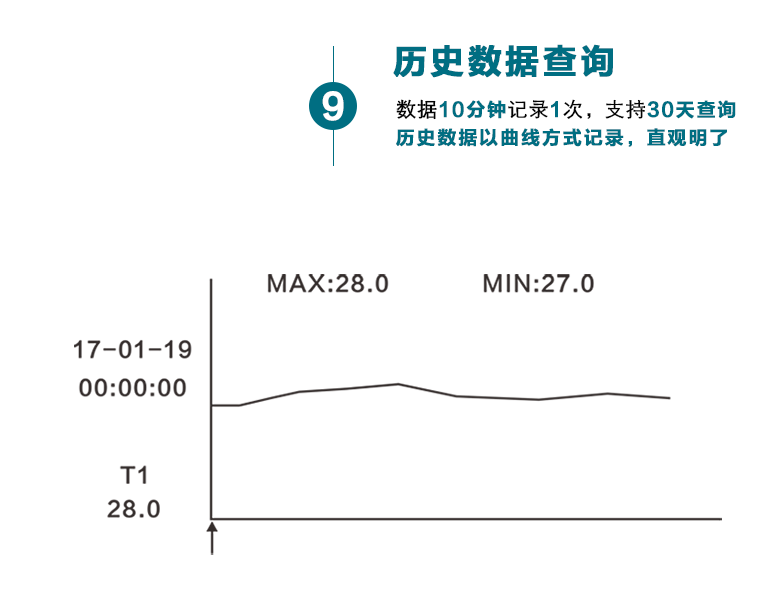 历史数据查询功能,数据每10分钟记录一次,多支持30天的数据查询。
