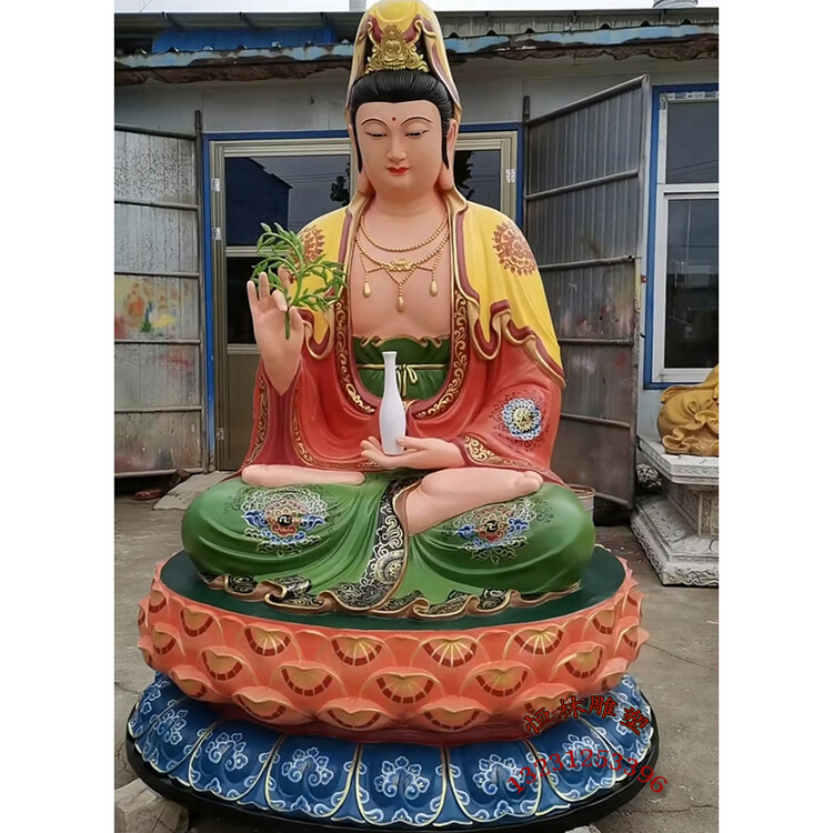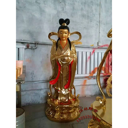 观音佛像,我们通常称为观世音菩萨 善财龙女铜像,纯铜铸造,高度1.7米,颜色可彩绘可鎏金可仿古,我们是铜佛像定做厂家,欢迎来电来图加工定制。