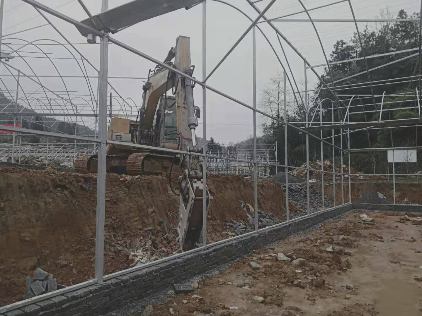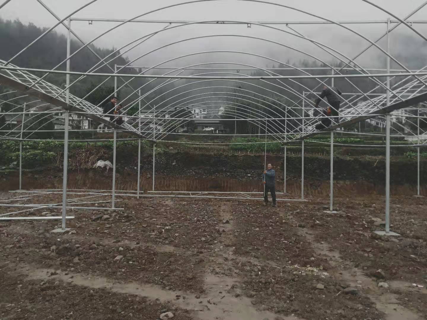 由于地形限制,我司进行了现场实际测量放线,针对性设计,实现了现有土地利用率大化,建成薄膜连栋温室大棚为不规则结构,呈梯形分布,共9栋,面积有大有小,从1152平米到4000平米。该项目是自动化育苗温室大棚,该项目跨2020年新年,有一部分温室先期建成,在剩余温室建设过程中,先期建成温室大棚就被投入使用,至8月1日项目验收通过时该项目已经出了两茬苗。自动化育苗温室大棚配备了电动外遮阳、电动顶开窗、电动侧翻窗、风机湿帘降温系统、水肥一体化系统,设备配电系统等,该项目所有钢材皆为热浸镀锌。