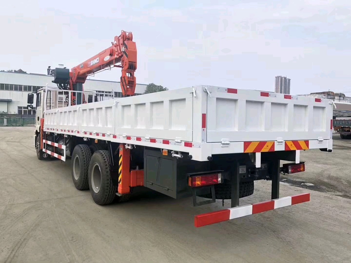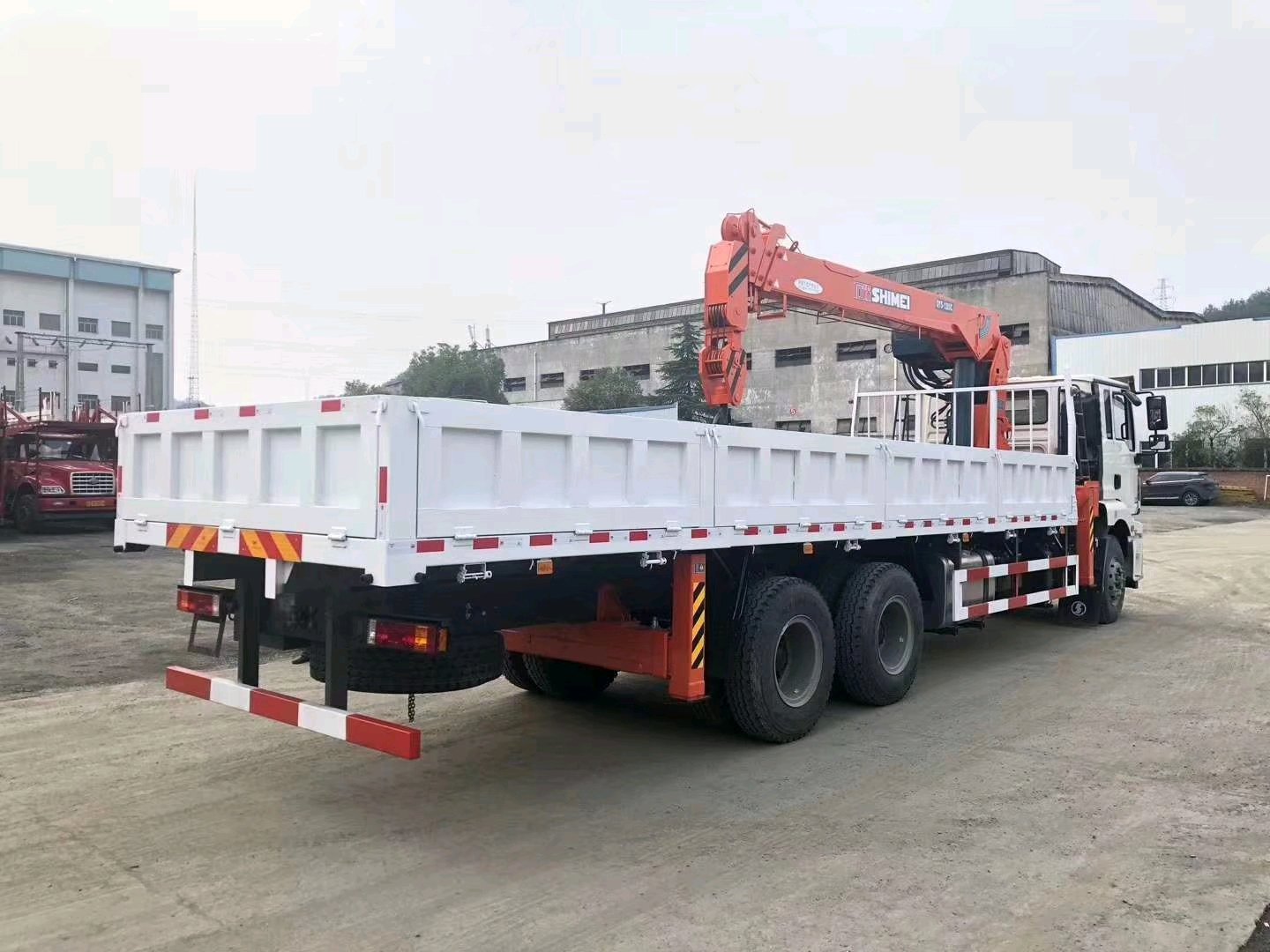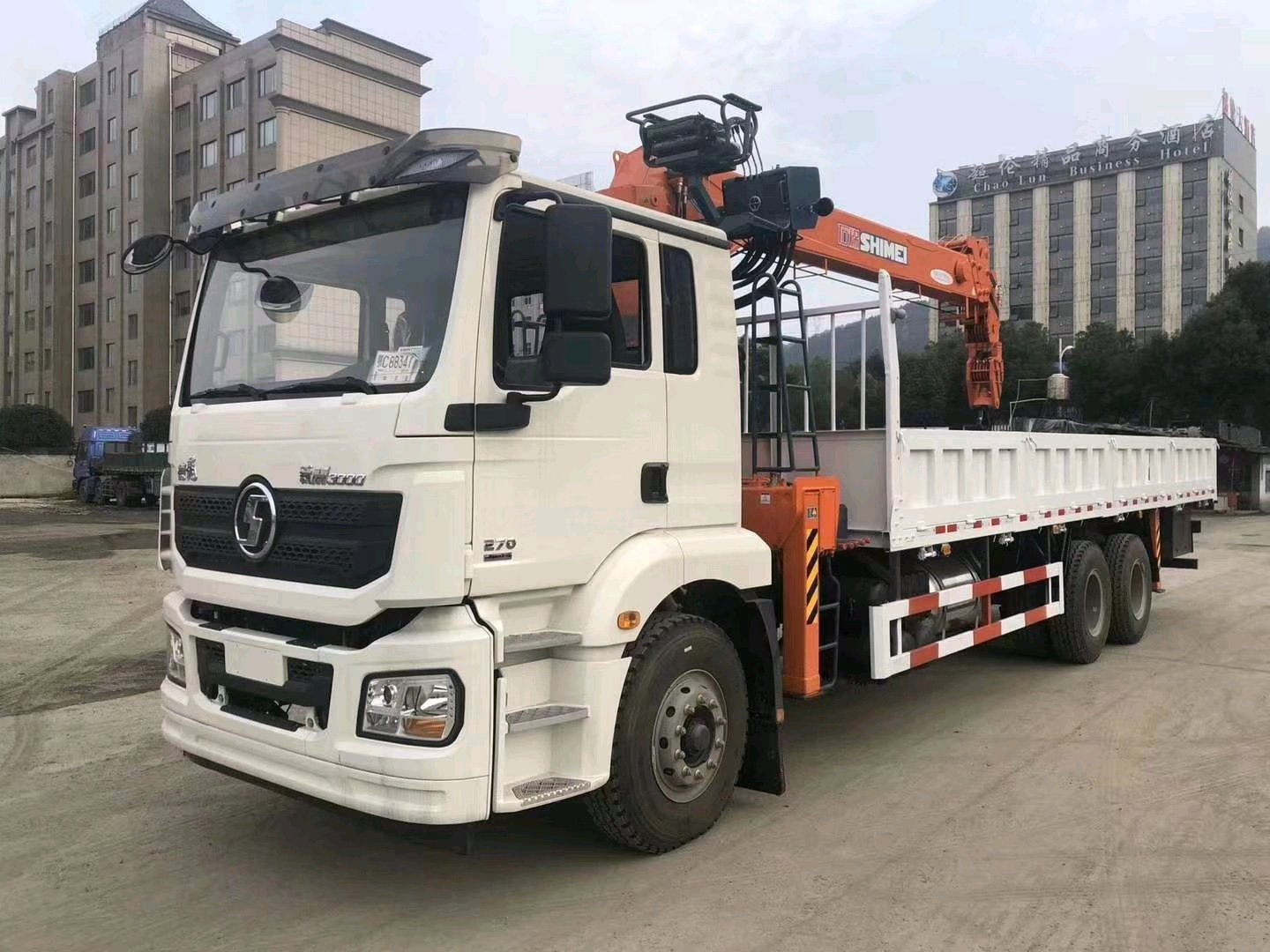 陕汽德龙新M3000后八轮,270马力加强版,低顶驾驶室、驾驶室液压悬置、空气主座椅、手动翻转、公路用保险杠、遮阳罩、电动空调、电动摇窗机,国产四通道ABS、车下启动熄火功能,8档变速箱,16吨双后桥,7.5吨前桥,通三层(8+5+8),轴距5775+1400,1200R20钢丝胎,400L油箱。上装石煤12吨4节臂吊机,上操作,工作半径14.5米,举升高度16.3米,全液压全回转。货箱长8.4米