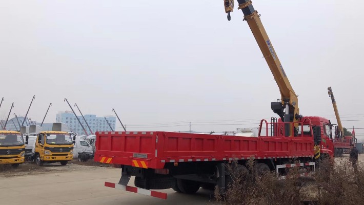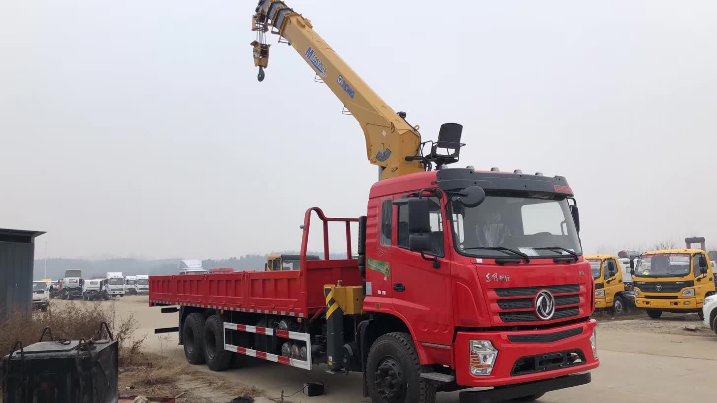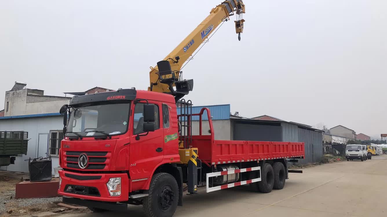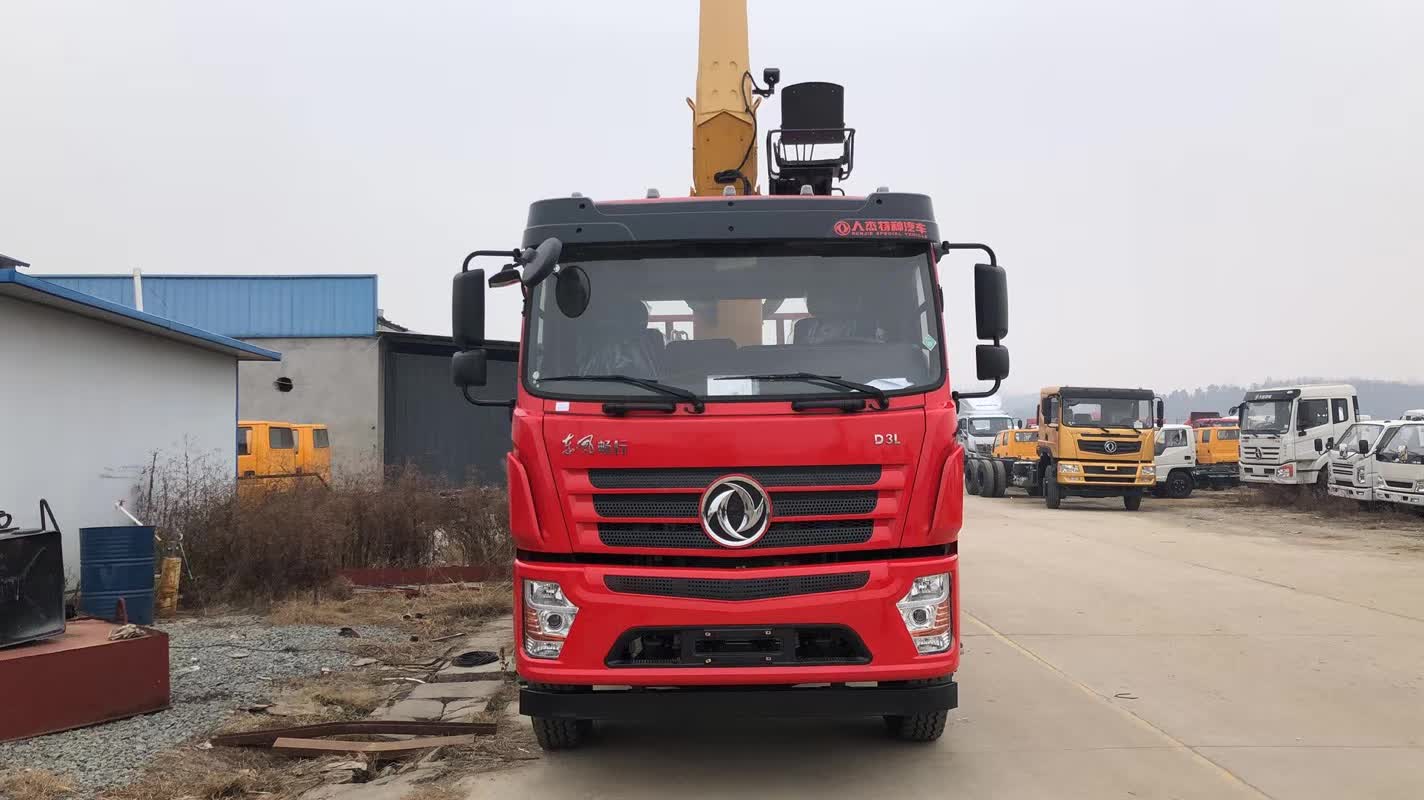 东风新款D3L豪华驾驶室﹝红色﹞,带气囊座椅,中控门锁 .带空调,YC6JA240-50发动机,法士特8档(高低速)变速箱,前桥5吨,双后德纳桥10吨*2,车架300mm直通三层,11.00R20 18PR钢丝轮胎,轴距5900+1300MM。带ABS、下防护。加装徐工12吨4节直臂双联泵吊机. .工作半径14.5米. 上操作. 带原厂单腔后支腿. 加装东风原厂8个厚滚钢通副梁. 边二底五全钢制降重心一体化货箱. 货箱尺寸:8500*2400*550mm.