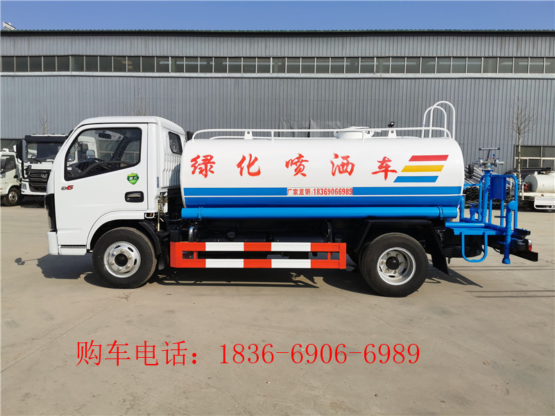 5吨洒水车 国六东风多利卡洒水车,罐体容积:5立方米。采用武钢4mm碳钢板一次卷压成型,完全做到无缝成型。罐体内设多道防波隔板,采用高压气体试漏检测,使罐体具有强度高,稳,车辆运载平稳。罐体外表为烤漆,罐体及各保险杠贴红白色视觉反光条,罐体两侧喷“绿化洒水车”字样(可按您的要求喷绘字样),罐体颜色出厂为上白下绿或上白下蓝(可按您的要求喷绘颜色)。