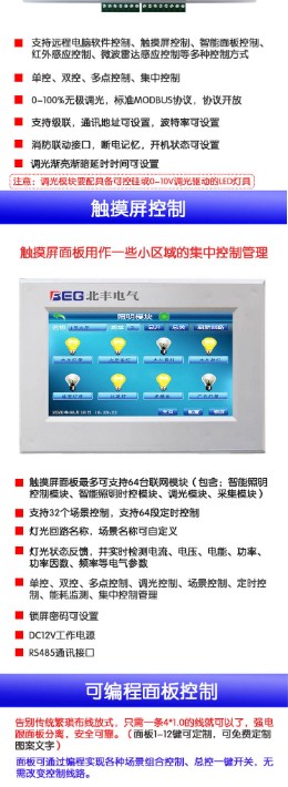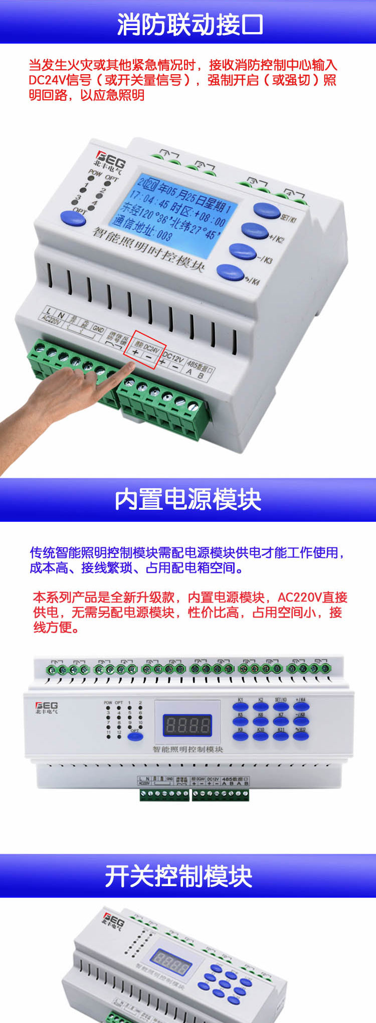 我们公司生产的智能照明开关模块有4路6路8路12路规格的,可手动按键控制,支持级联,可多回路组合扩展,支持242台模块组网,RS485通讯接口,标准modbus-rtu通讯协议,协议开放可与第三方BA中控连接,提供技术支持,模块安装调试简单。模块内置电源模块,可直接220V供电,无需另配电源模块,模块通讯地址和波特率可通过模块数码显示设置更改。有消防联动接口,消防强启或强切可设置,开机状态也可以通过数码设置,有断电记忆功能,模块接通工作电源时,所有回路保持断电之前的工作状态,全开功能,模块接通工作电源时所有回路来全部开启,全关功能,模块接通工作电源时所有回路全部关闭,还可设置回路之间开关延时间隔时间。模块采用原装进口芯片和品牌元器件,质量有保障,采用大电流负载型功率继电器,机械耐久性强,线路板涂覆三防漆,防潮,防尘,防漏电,产品经过严格的测试,72小时通电联网老化流程,质量稳定可靠。北丰电气LQSE-4S10-D 4路开关控制模块