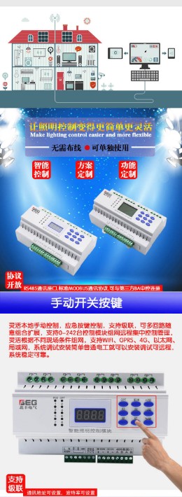 我们公司的智能时控模块有4路6路8路12路规格的,控制器每个回路可立设置多段定时、光照度控制、天文时钟经纬度控制、还可以设置经纬度加定时加光控混合控制,例如:每天经纬度开灯,关灯可以按定时设置提前或推迟。节假日星期模式,开关延时设置。有消防联动接口,RS485通讯接口,MODBUS通讯协议,协议开放。经纬度控制功能:设置好当地经纬度后控制器每天自动计算出天黑天亮时间,四季变化规侓会根据当地日出日落时间的变化自动调整开关灯时间