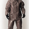 款式:连体式前拉链式防护服,袖口与裤管有松紧带设计与面部开口头套,附连体防化袜套与防化靴保护盖,热合胶带缝合;