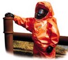 款式:连体式前拉链式防护服,袖口与裤管有松紧带设计与面部开口头套,无防化袜套,热合胶带缝合;