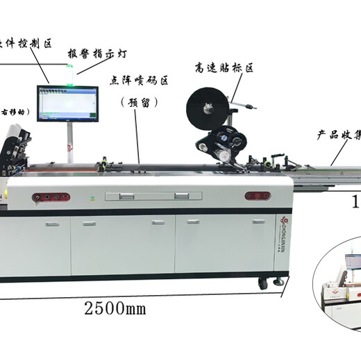 可移动式发料头----点阵喷码贴标(预留)-----高速贴标--加长收料(可以根据客户需要增加OCR检测、点阵喷码,剔除及超声波双张检测计数)
