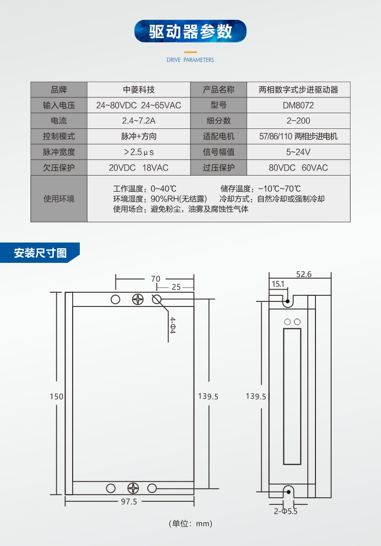 » 中菱科技两相DM8072步进驱动器57/86电机马达控制器点胶机焊锡机