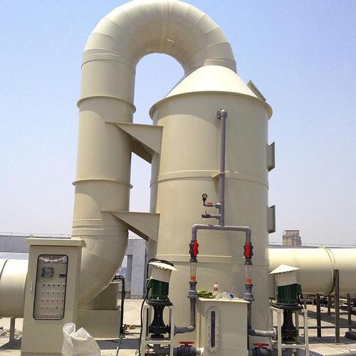 除臭设备由圆形塔体,用法兰分段联接而成。具体结构由进风段、压力室、鼓泡贮液箱、两级喷淋段、旋流板、出风锥帽等组成。其特点是:制作方便、便于按装检修、强度高、占地面积小。废气由风机压入净化塔的内筒形成压力室,再由压力室均配给每根鼓泡管,废气通过鼓泡进入贮液箱的吸收中和液中产生鼓泡,使气液充分接触,提高净化效率。然后进入喷淋层,喷淋形式采用双层填料,两级喷淋,使气液充分接触,提高净化效率。本塔配用一台玻璃钢离心通风机和塑料水泵或不锈钢水泵即可。当处理风量在10000立方米以上时,采用二台水泵就能达到设计要求。