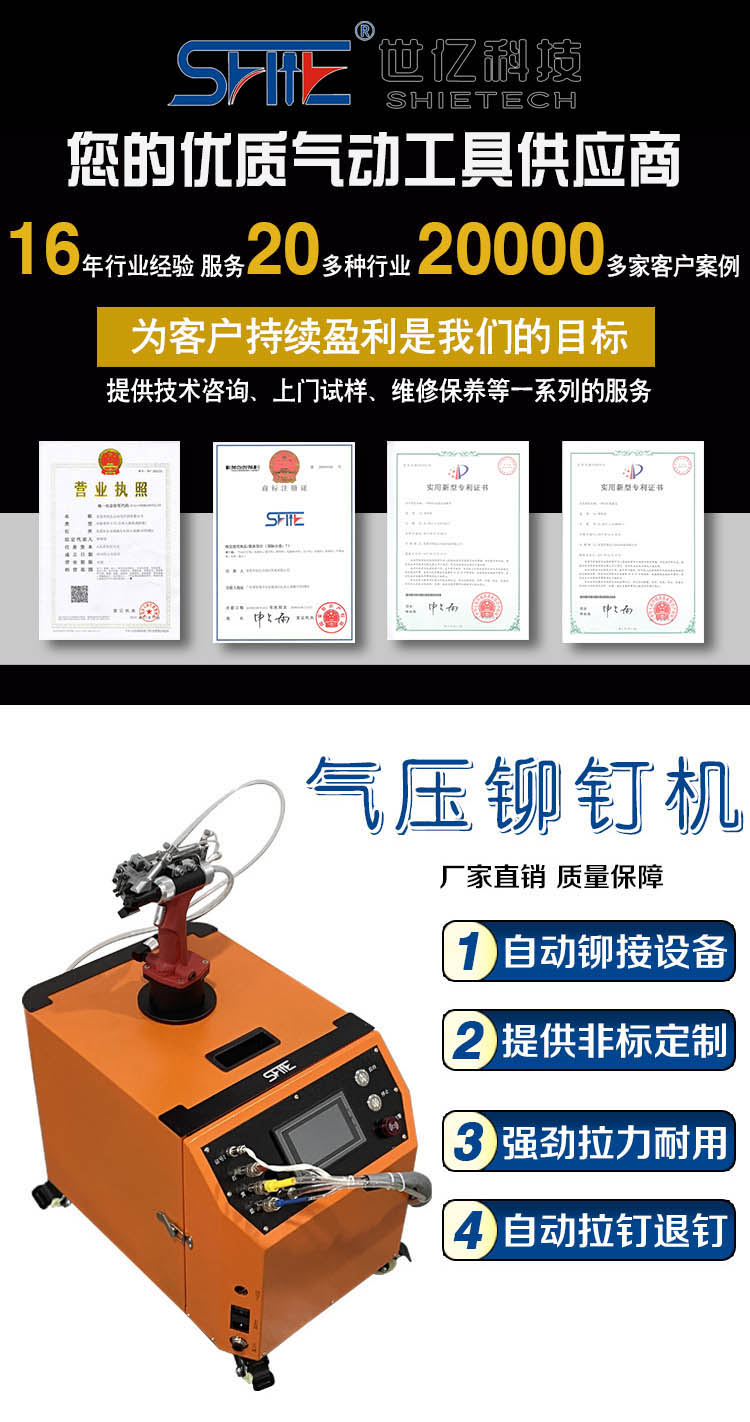 1、自动拉钉机是针对抽芯铆钉而研发的,一般采用气动拉铆钉枪来拉断,通过气压吸式的方式,将铆钉的钉杆拉断。