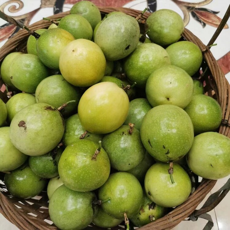 适时采收,果实变紫红或黄后采收,也可以等果实成熟自然脱落后,从地上拾新鲜落果。鸡蛋果成熟后会自然落地,应及时捡拾,好在果实落地3天内收拾,否则果实受日晒雨淋,容易腐烂。果实成熟所需的时间因开花季节的不同而异,一般5-6月开的花,花后40-60天成熟,7-8月开的花需60-80天成熟,9月开的花需要80-90天成熟,10月或以后开的花则需要90天以上,果实才能成熟。鸡蛋果是一种热带藤本常绿果树,寿命长达8-10年。果皮厚而坚硬,可作饲料和提取果胶,果实球形或长圆球形,内有黄色果汁和黑色种子,含有蛋白质、脂肪、糖类和多种维生素及氨基酸等,营养丰富,酸甜可口,有石榴、香蕉、草莓、柠檬、芒果、酸梅等多种水果的香味,风味浓郁,芳香怡人,可鲜食和加工,可以加工成果汁、果露、果酱、果冻、口含片,主要以加工成果汁食用为主。果实非常耐贮藏和运输。优诺苗木出品