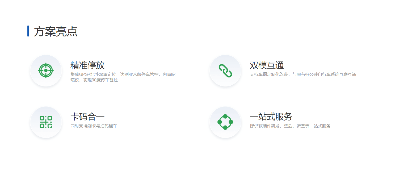 互联网电单车解决方案通过打造“软件+硬件+售后+运营” 的一揽子解决方案,服务城市3-10公里出行半径,与公共自行车互为补充,成为市民中短途出行的重要交通工具。
