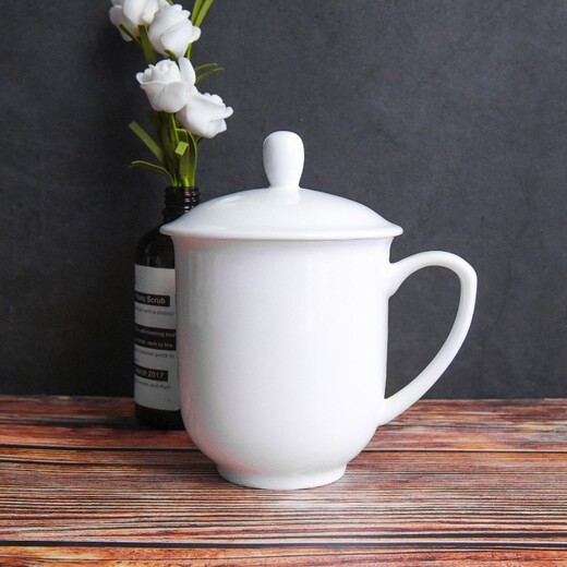 » 批发骨瓷茶水杯陶瓷带盖办公水杯家用马克杯白胎商务会议杯盖杯