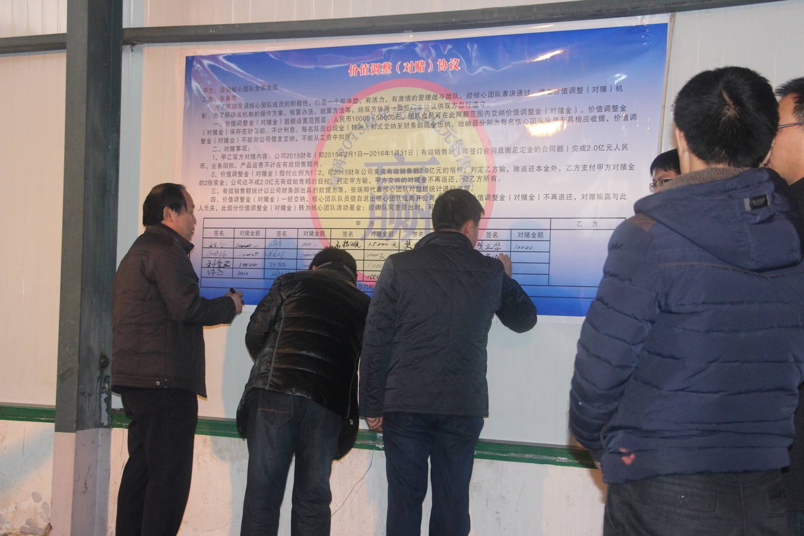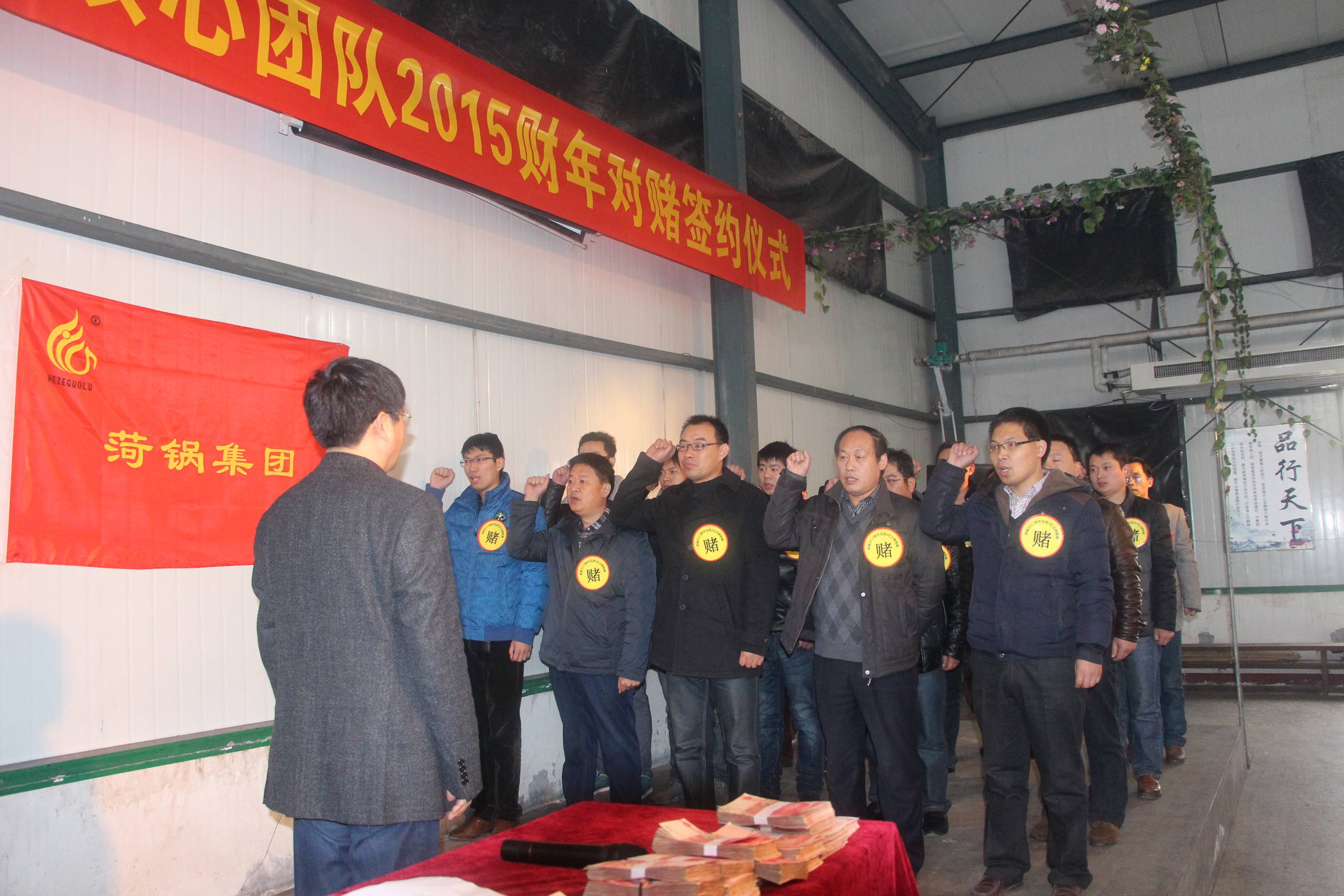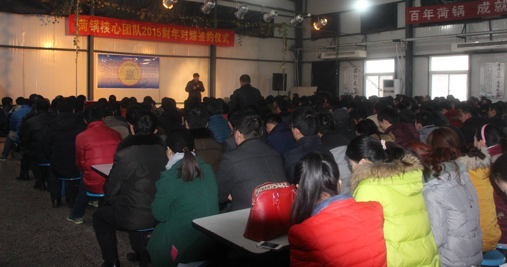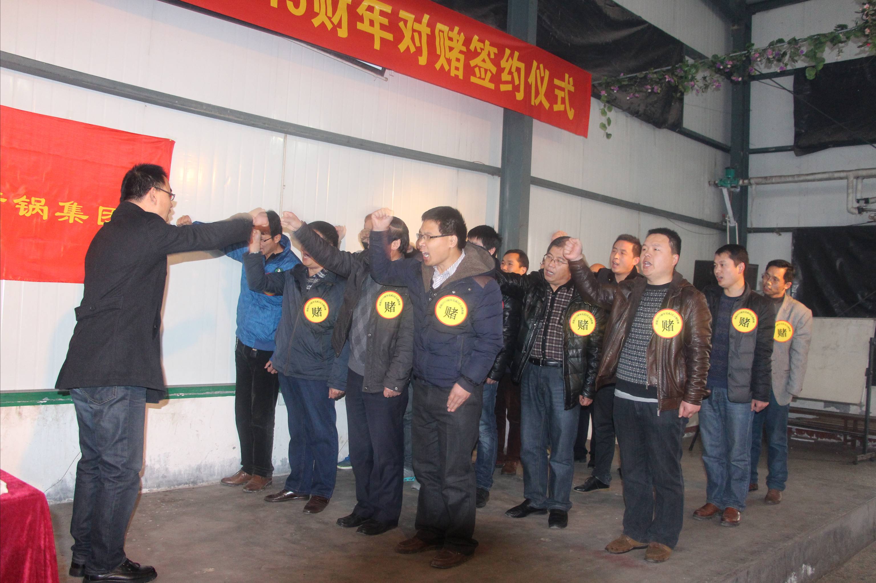 菏锅核心团队对赌签约仪式在公司多功能餐厅举行,全体行管和生产人员观看了此次仪式。仪式基本议程分为:张总致辞、核心团队公众承诺、缴纳对赌金并签订对赌协议、核心团队宣誓和士气展示、张总总结讲话 等几个环节。