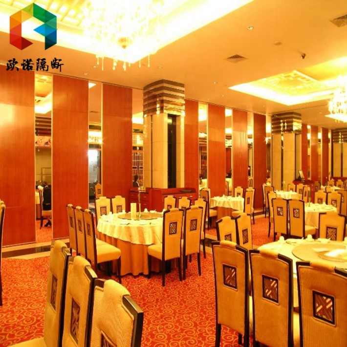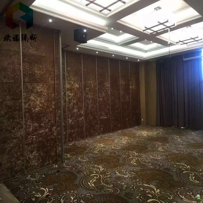 欧诺酒店移动隔断系统采用德国生产技术,隔音、隔热、阻燃、灵活、安全、环保为一体,置隔多用,收展灵活。顶部钢结构隐蔽连接,铝镁合金材质路轨,进口尼龙加钢圈双水平吊轮,悬挂式安装,地面不铺设轨道,平移收纳至藏板位,移动灵活、静音、耐磨、单件门板左右两侧凹凸口对接,上下内置伸缩结构,钥匙开关,紧密贴合。内部填充隔音防火材料,各项参数均达到国家标准。
