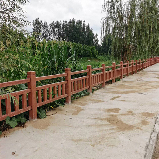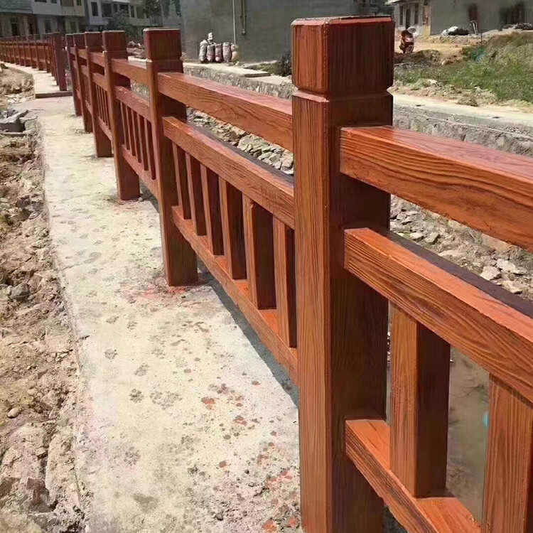 1.5米六立柱仿木栏杆的组材料为水泥混凝土,在表面呈现木材的天然纹路。优点众多,色泽保持原木光泽、纹理能够以假乱真并且十分坚固、周身好打理方便维护、造型大方美观,而与自然木材相比,在如酸、碱、潮湿、腐蚀的严酷环境下,水泥仿木的耐候性远超自然木材。能够和谐地融入自然环境之中。