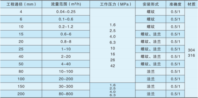 主要特点:◆结构紧凑轻巧,安装维护方便;◆压力损失小,有自整流的结构;◆精度高,重复性好;◆下限流速低,测量范围宽;◆可获得很高的频率信号,信号分辨力强;◆较强抗磁干扰和振动能力、性能可靠、寿命长;◆采用的功耗单片微机技术,整机功能强、功耗低;◆叶轮具有防腐功能,耐腐蚀,适用于酸碱溶液;◆适用于高压测量。主要技术参数:◆基本参数:(见表)