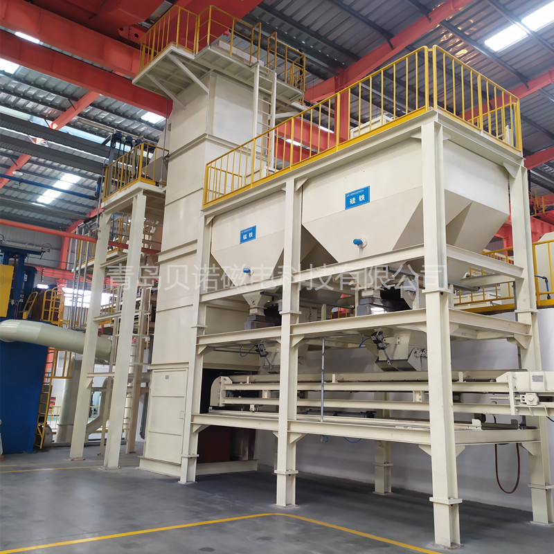 用于炉前孕育剂的自动称量及自动投入。各种孕育剂分别储存在高位料仓中,由电磁振动给料机振动料,低开式称量斗称量,皮带机输送。可自动配送多种孕育剂,配料精度高,配料数据自动记录保存。