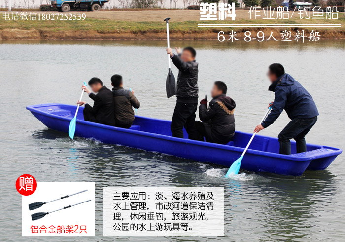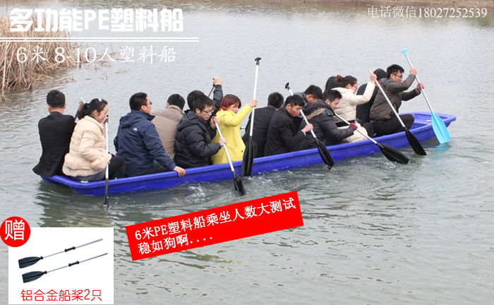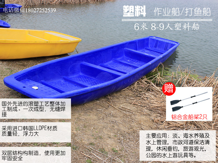 本品采用韩国进口聚乙烯塑胶原料及国外的(ROTATION)滚塑工艺,一次成型,无缝焊接,抗冲击稳定。此船的密度比玻璃钢和铁质的船密度要小,所以浮力强,质量轻,即使在船体灌满水的情况下也不会下沉。