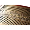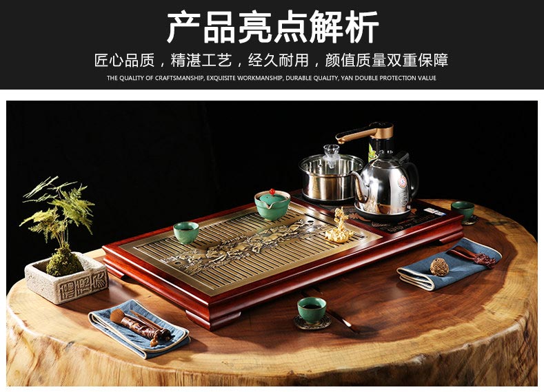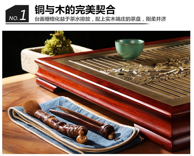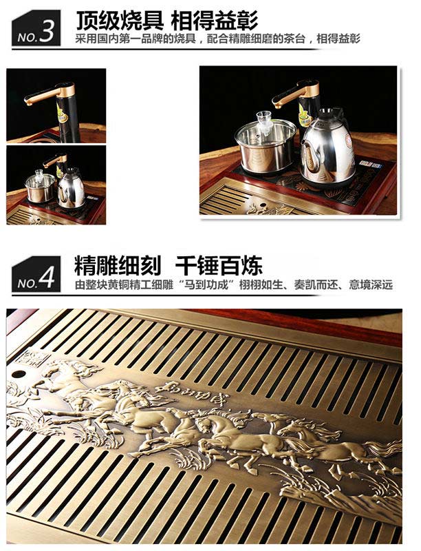 品牌为铜木天下,是由匠铜实业(杭州)有限公司荣誉出品,由刘华团队呕心力作,整张黄铜精雕而成骏马图栩栩如生,黄铜卫生,是茶桌茶台的选择,配上两仪图案,刚柔合济,意韵十足。