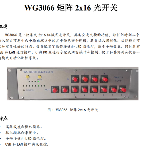 概述 WG3066 是一款集成 2x16 机械式光开关,具备全光交换的功能,即任何时刻二个 输入端口可与十六个输出端口中的其中任意四个连通,具备插入损耗低、功能稳定可 靠和重复性好的特点。设备配置了操作按键和 LED 指示灯,便于手动设置。同时具有 USB 和 LAN 通信接口,可由 PC 发送指令完成所有操作和控制,便于和其他测试仪器一 起构成自动化测控系统。