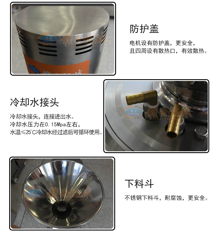 胶体磨是一种研磨设备适用于较高粘度物料以及较大颗粒的物料有效地乳化、分散和粉碎,达到物料细粉碎及乳化的效果。它的工作原理是由电动机带动转子与定子作相对的高速旋转,被加工的物料透过定子,转齿之间的间隙时受到强大的剪切力、摩擦力、高频振动等物理作用,使物料被有效地乳化、分散和粉碎,达到物料细粉碎及乳化的效果